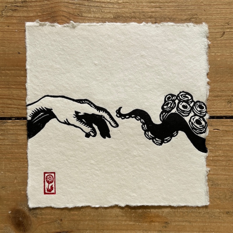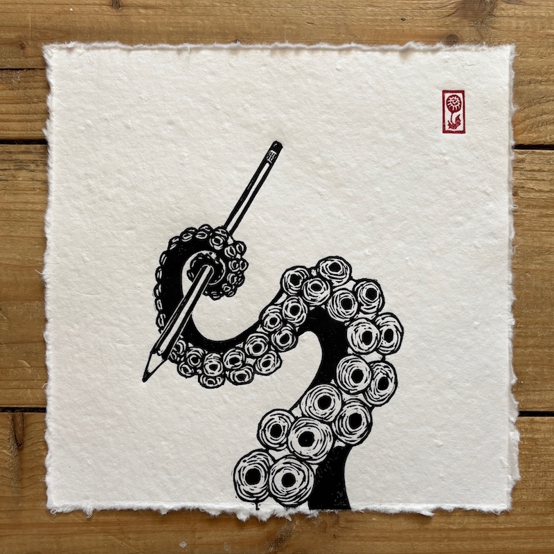 Although Kong doesn’t feature in my work as often now, I’ve done a few prints of him - including my very first linocut. These days, tentacles have taken on a similar role. My first tentacle print came from combining two unrelated items on my to-do list: “tentacle” and “retro pinup singer.” The result was a tentacle holding a retro microphone, which led to a whole series of tentacle-themed prints. Like Kong, tentacles often help me find a way into a prompt or serve as a jumping off point for ideas and they have become a playful and versatile motif in my work.