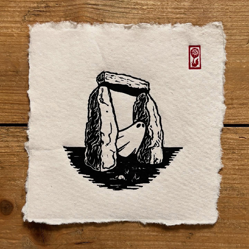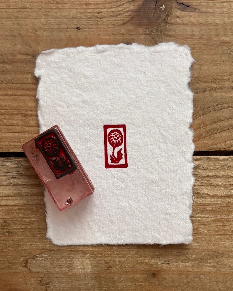 I hand-carved the stamp myself. The first version of the design came about in November 2020, shortly after I began printmaking. I refined it in January 2021 when I got some finer tools that allowed for more precise carving. The current version was created about six months later, when I needed something smaller for a particular print - and I’ve stuck with it ever since. It’s roughly 2cm by 1cm and mounted on a set of rectangular resin blocks kindly made for me by my daughter. Before that, it was mounted on the bottom of a cork, but that made alignment tricky. The resin works much better.