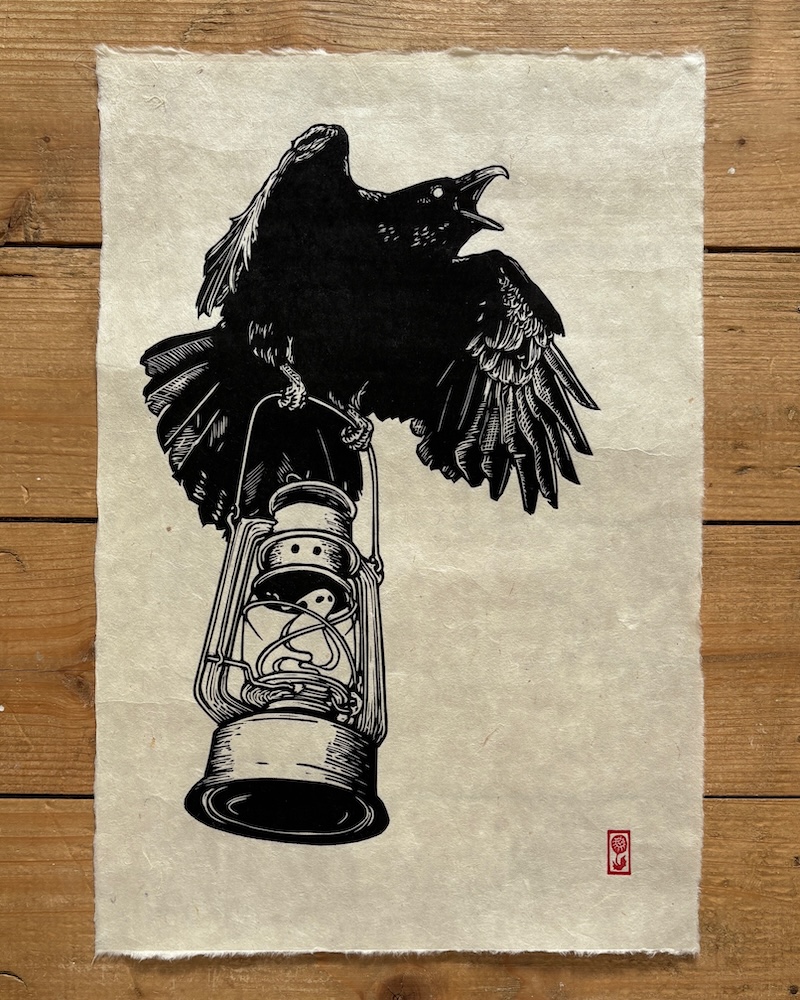 I also enjoy making wildlife prints, and corvids - especially crows and ravens - have become a favourite subject. I find them fascinating: they’re incredibly intelligent, steeped in myth and folklore, and visually striking. Their black colouring makes them especially well-suited to linocut.