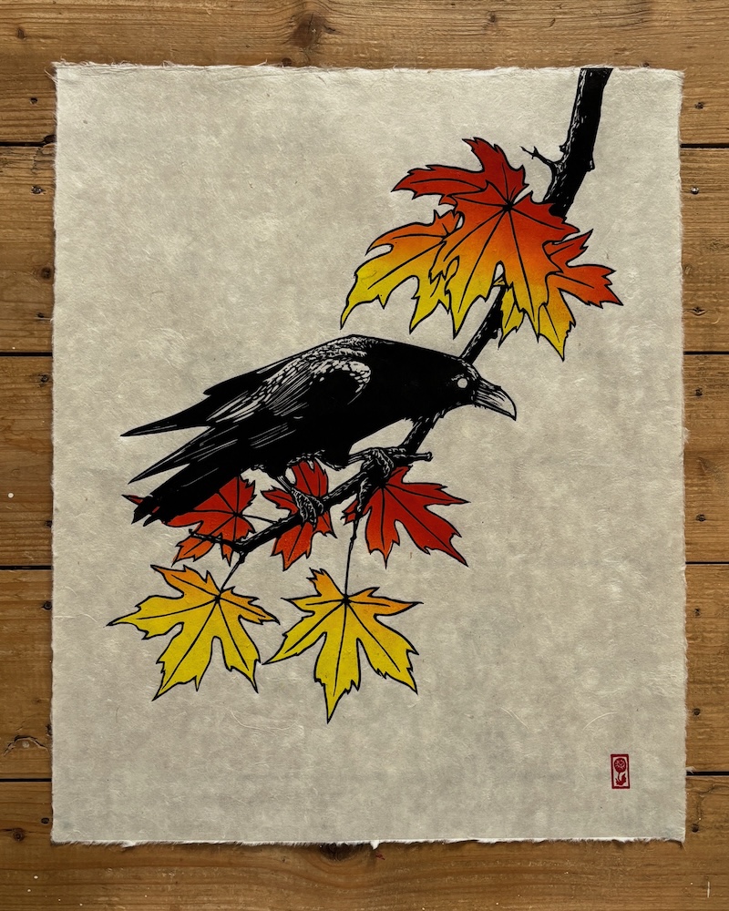 Returning to that theme of connection, I recently made a print of a raven perched on a tree branch, with leaves in rich autumnal colours. I was inspired by the fiery reds, oranges, and yellows I’d been seeing in the trees around my home. I wanted to celebrate that seasonal beauty and capture the joy I felt in witnessing it - using colour as a way to connect with the autumn.