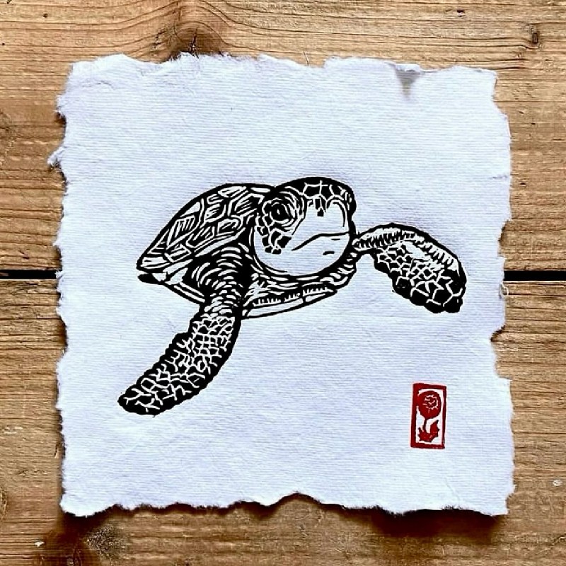 Once carving is complete, I move on to printing. Ironically, it’s often the part I enjoy least, though I do love seeing the final print come to life. To print, I roll ink onto the lino block using a brayer, then place paper on top and press. When I first started, I hand-burnished my prints using a wooden spoon or baren to transfer the ink. These days, I use a lever press, though many prints - especially those on thicker or textured paper - still require some degree of hand burnishing.