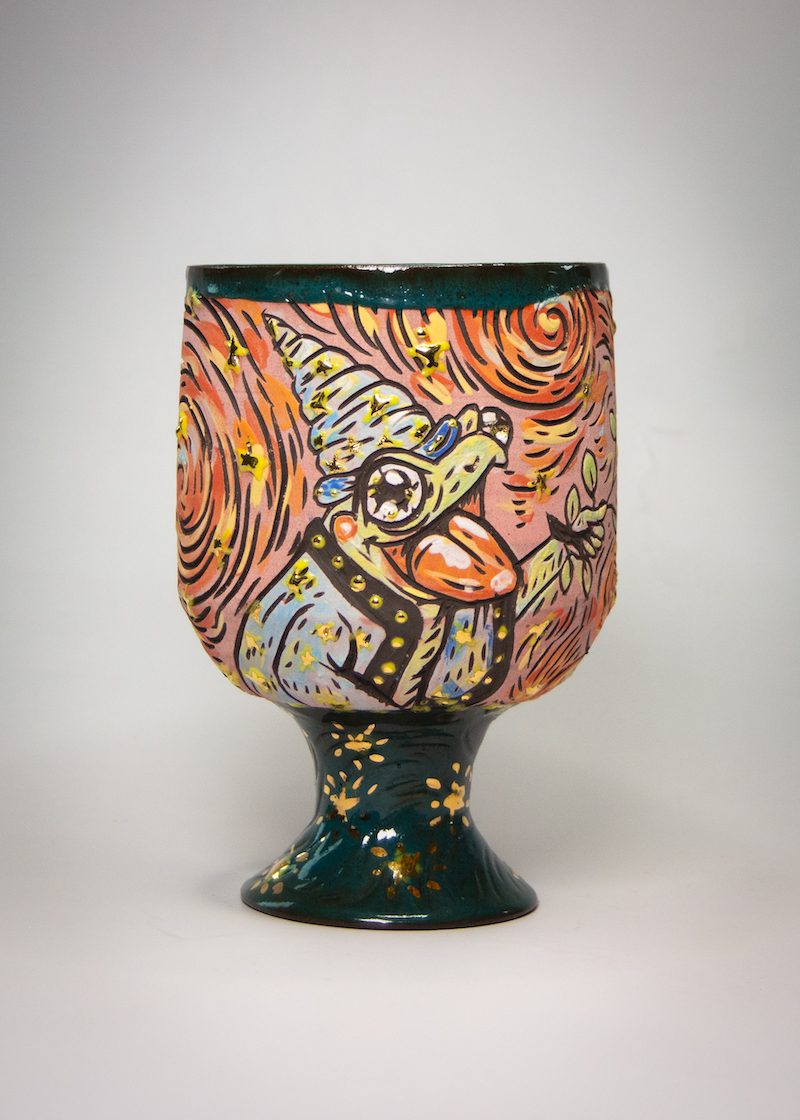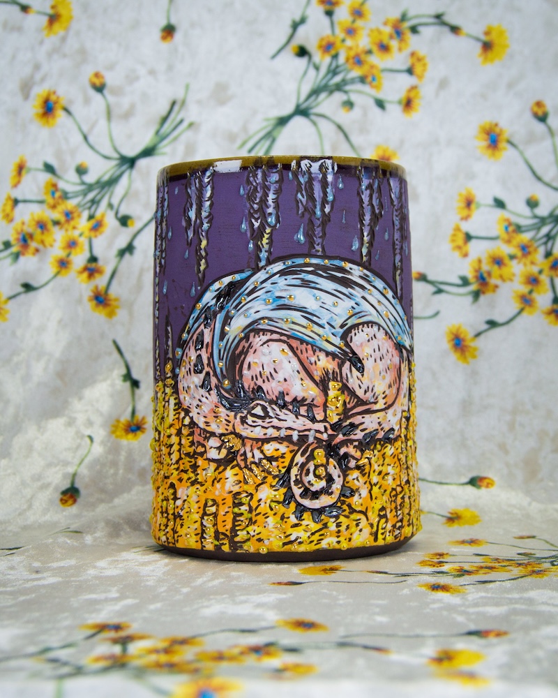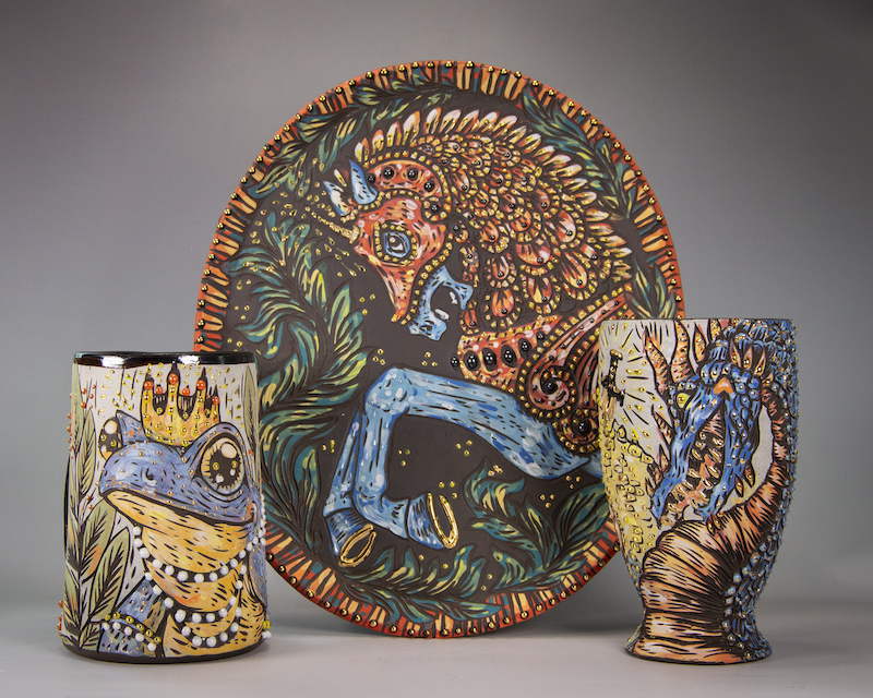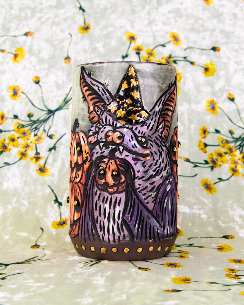 Ceramics take a long time, I’d say I generally take around 4 weeks to get things made from start to finish if I’m moving at a normal pace. I like to make my work in batches, so I’ll usually throw around 20 mugs at a time, get them all prepped with whatever other pieces I’m wanting to make, and work on only those until they’ve been fully painted, fired, and completed. I usually will make the pots first and figure out the designs second, but I normally have one or two new designs in mind that I want to try. I don’t like making the same exact thing more than twice so there’s always moments of me going “what if I tried this same frog design in this different color, and maybe with this texture instead of what I just did?”