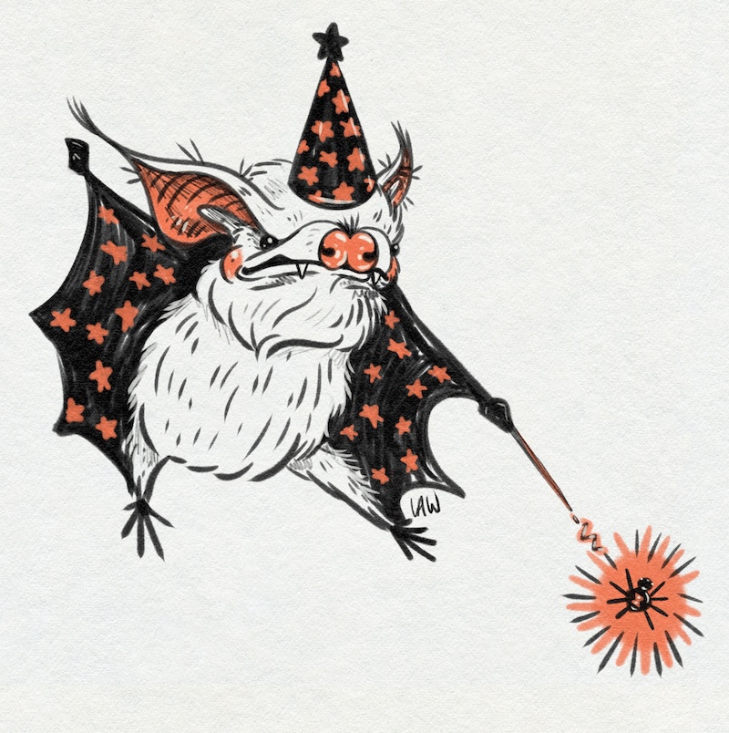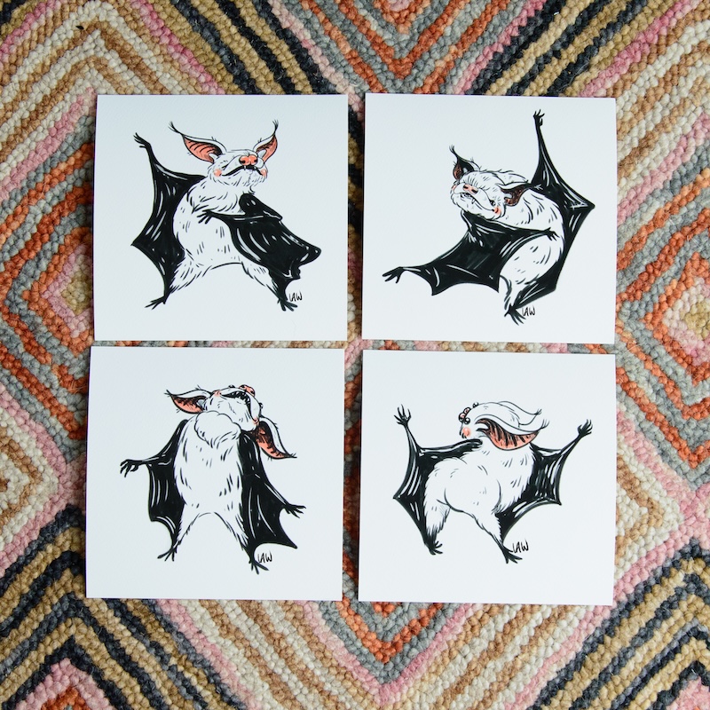 Sometimes I know where they come from and sometimes they just kind of show up. My bats started popping up a few months after I spent a night in a national park in Utah; I was sitting out under the stars with some hot chocolate having a grand old time and thought I was seeing some really dumb birds flying around in the dark, and then I realized it was bats! I’d never actually seen them out like that, I didn’t realize how erratic they look when they’re flying (I kept joking that they looked drunk). They bob and weave and dive super chaotically when they’re trying to get a bug, it was just really cool to see. When I finally got some time at home to relax I felt a really strong need to draw some bats, and eventually this little character kind of materialized. It goes the same way with most of the critters I make, I see one out in the world doing whatever weird animal thing it’s doing, and I get fascinated. I was watching hummingbirds fight over some nectar in the spring, noticed that they move with their beaks kind of like tiny rapiers, and I just wanted to draw little fencing hummingbirds (still working on that one). I don’t have a better way to explain it really, it kind of just happens, and it’s pretty fun when it does.