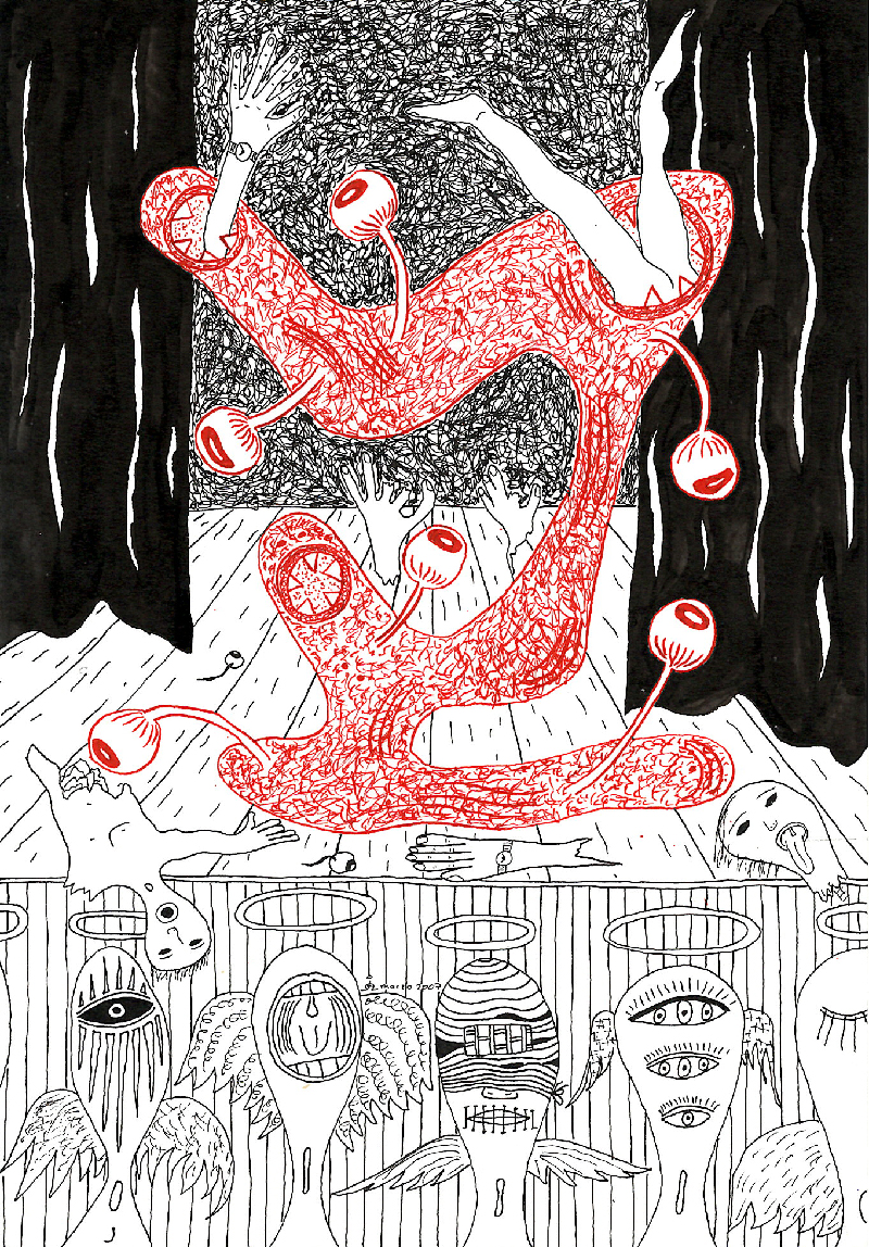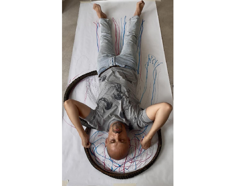 Now I am doing more and more installations and performance. I like to combine drawing, painting, and collage to “build” spaces in which multiple elements interact and resonate with each other. And then I make a performance in the “scenery” that the installation has created. The 2 most recent projects I have done are “Fuera de Ley” (out of law) inspired by a poem by Alfonsina Storni and “Cinco Bocas” (five mouths) inspired by a poem that I wrote in Venice 20 years ago. By mixing techniques and creating installations for performance I give life and movement to my art. I started drawing only, but the drawings, even if very expressive, were flat and lacked movement. Painting brought colours and texture. Collage brought depth and playfulness. But installation and performance are bringing movement, life and unexpected reactions and interactions with the public.