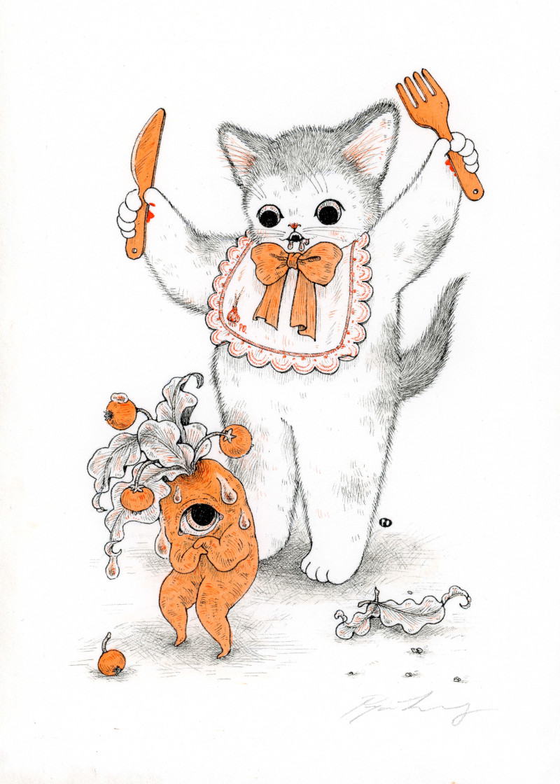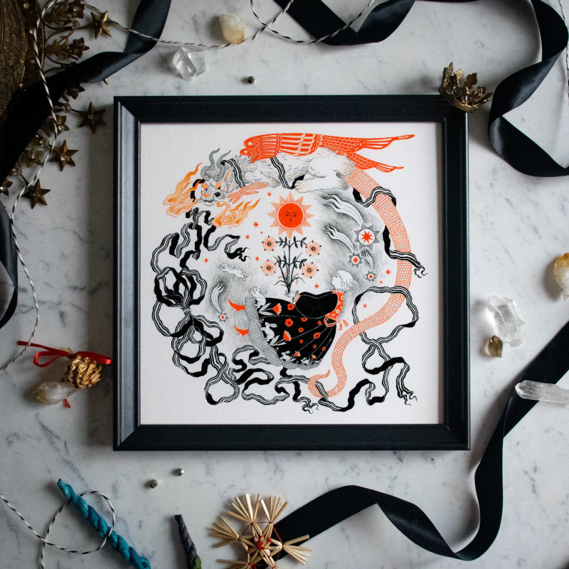Most of my work is done using pen and vermillion ink, which creates the recognizable black and orange color palette. I like using watercolor paper with a slight texture because it adds warmth and a tactile feeling to the piece. The use of vermillion actually started by accident. My parents once gifted me a traditional Chinese calligraphy set that includes a small bottle of vermillion ink. I started experimenting with the ink and quickly fell in love with its vibrant appearance.