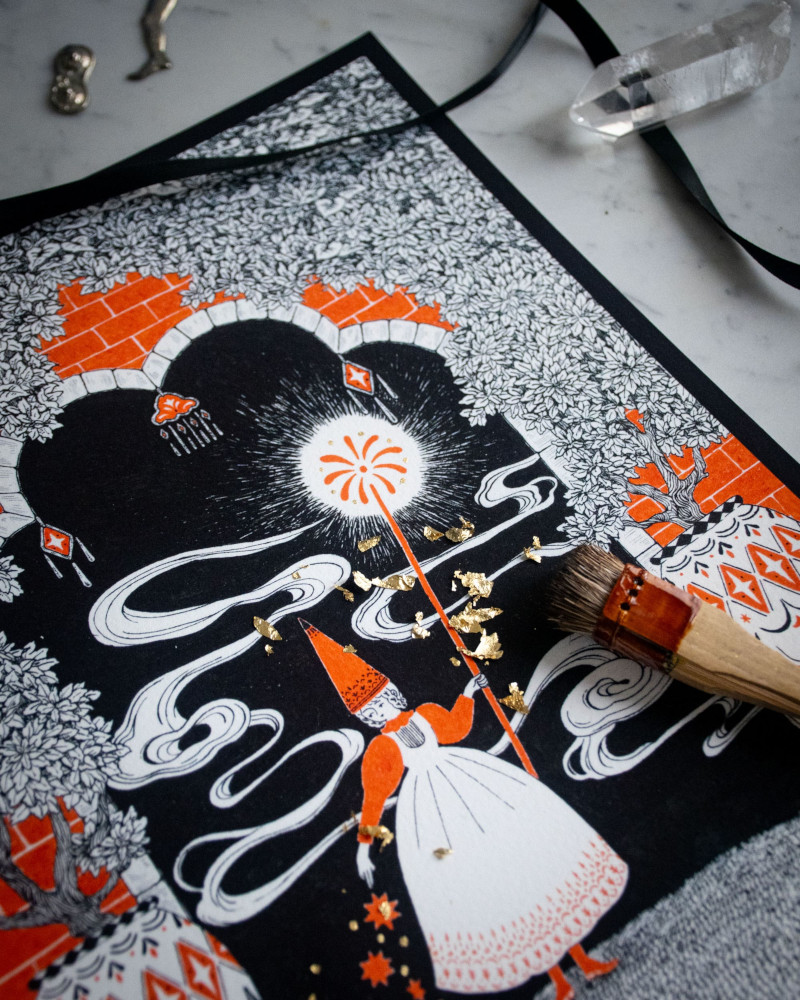 These three words stand out to me because they express the feeling I want to share through my art and how I hope people experience it. Magic is both a feeling and a theme in my work. I often draw magical subjects, such as tarot, alchemy, and fantastical creatures. Sparkles remind me of moments that feel like a nighttime festival, with colorful lights, music, and a happy atmosphere. Fun is straightforward: I want my art to feel carefree and a bit silly, like the part of us that invents stories and laughs at little things.