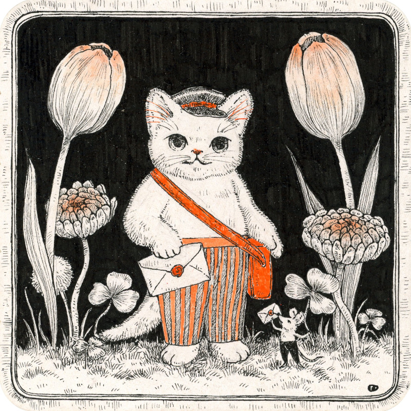 Working with just two colors allows me to focus on what I enjoy most: experimenting with patterns, shapes, and details. It also helps me avoid feeling overwhelmed by too many color choices. Inspiration comes from everywhere, so it is hard to pick just one source. I enjoy observing real life and jotting down notes in my sketchbook. My cats, strange dreams, random chats with friends, nature, silly ideas, and little moments all find their way into my art.
