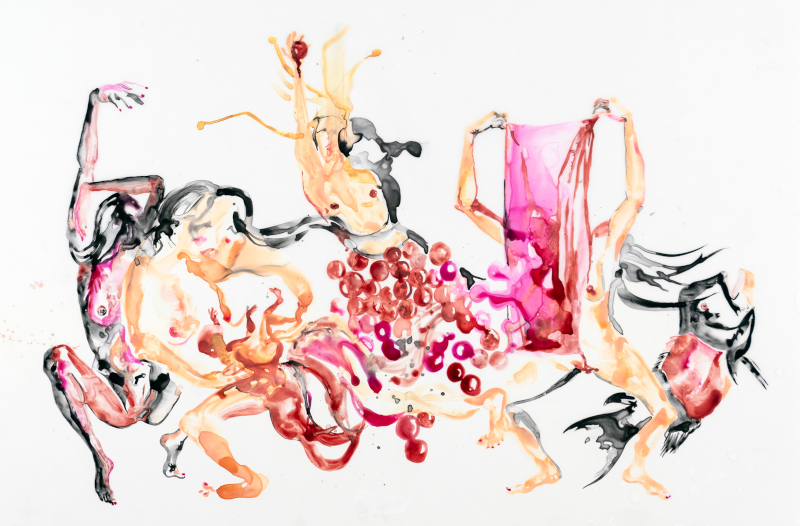 The other element at the core of my subject matter is the use of my own body. When I have an idea, I will often act it out, doing a kind of private performance for my camera, and use those images as the basis for my paintings. This depiction of the self is of varying importance in the final result, but that important step of using my own body in the image sourcing really drives the performative aspect of the painting for me. Then, when I am finally executing the image and putting down on the drafting film, it is often a performative event as well: it involves my whole body, hovering over the work and puddling, splashing, and blowing on these big pools of ink. This is where intuition and muscle memory of how to paint automatically comes into play.