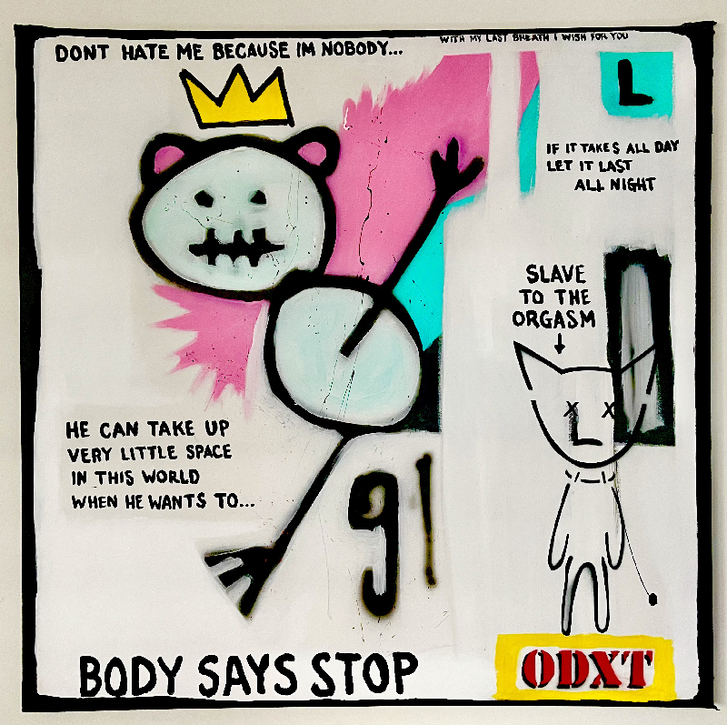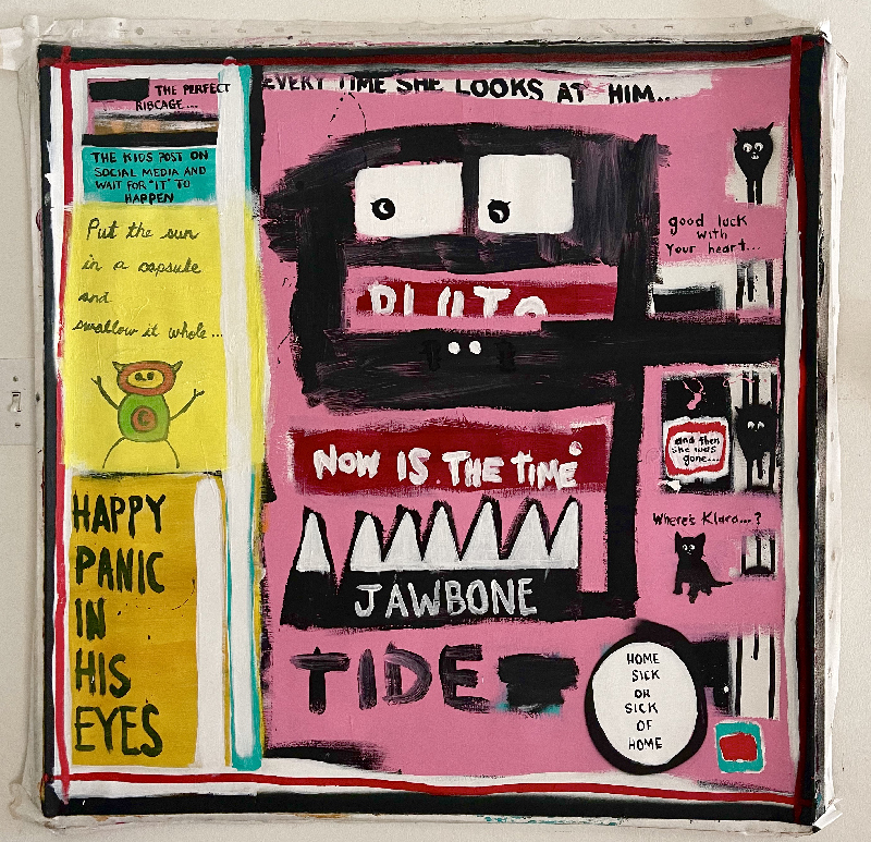 I think people romanticize an image of an artist brimming with inspiration, effortlessly producing collections of work with skill and talent. In reality, the process of creating art is messy, chaotic, and frustrating. I frequently grapple with self-doubt and failure on the way to arriving at a work I feel satisfied with. I'm drawn to a style that favors innocence and self-expression over technique. It's funny that my process to achieve that is actually deceptively complex and laborious. Capturing the spontaneity and innocence of a childlike style is surprisingly a meticulous process of refinement which I struggle with and that struggle itself is shared and exposed within the layers in the art. In my experience, achieving a sense of naivety and playfulness on canvas requires a total rebellion against technical skill and craftsmanship, and everyone knows rebellion is fun