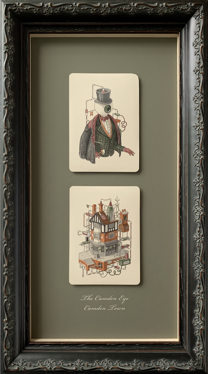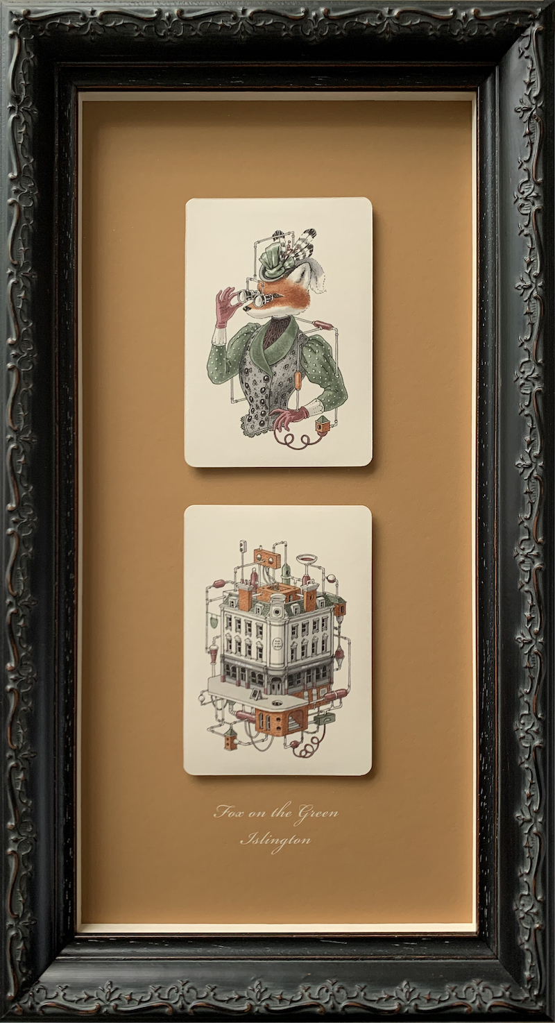Around 2019 I created a beautiful series of miniature drawings inspired by London pubs, their architecture, names, and signage. Particularly the evocative names given to pubs, for example Cat & Mutton, Fox on the Green, the Jugged Hare, The Camden Eye, inspired me to imagine a unique, fantastical personality for every one of the eighteen pubs included in the project. I employed a style of drawing which lends itself to a multitude of interpretations, giving viewers the freedom to develop their own reading of the mysterious characters I created. Then I devised a way of framing the drawings two by to, in a style that enhanced their jewel-like delicacy and pastel colours - floating above backgrounds in matching tones, with the name and location of the pub in white lettering, in vintage style box frames.