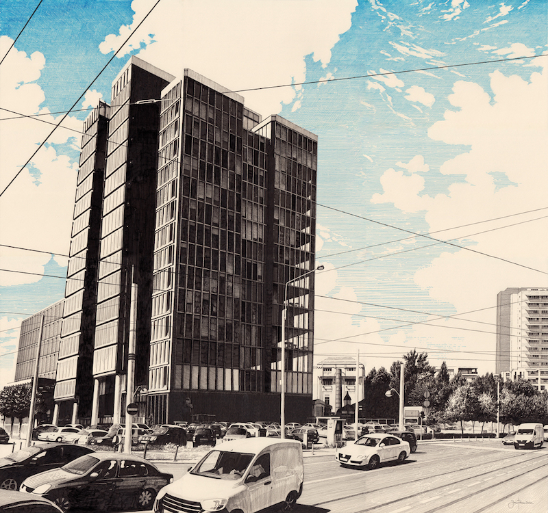 I’ve always been drawn to architecture, when I was a kid for a long time I wanted to become an architect. Particularly traditional or historic architecture fascinates me, because of the care and attentiondetailails that used to be intot in building and decorating. I think back then people were more invested in creating beautiful, aesthetically pleasing buildings whereas today most contemporary architecture is simplified, stripped of almost any trace of decoration, and focused on utilitarianism. Cost efficiency is invoked as the principal reason for this, but I am not too convinced by that. I think it’s more likely that contemporary architects want to distance themselves from previous styles and make their own mark. It’s understandable to a point, but I think this has led to a big divide between their work and ‘normal people’s’ taste and need for beauty. Modern and contemporary architecture is beautiful in a sort of intellectual, abstract way that can be difficult to understand by many people. In my work, I try to depict both. The dialogues that arise between old and new architecture, and the tensions too, particularly in urban environments, are very interesting to me and I like to capture that in my work.