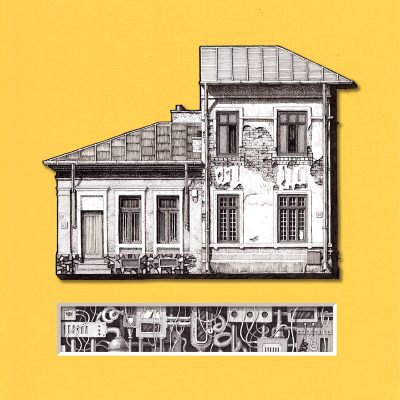 As for my references, normally I use my own photos, or photos provided by my clients, but sometimes in certain projects I also draw certain elements from imagination. For example, the drawing collage ‘Berzei 2’ contains a few elements, such as the cat eyes, the lens on one of the roofs, and steampunk / industrial imagery, that I just made up.