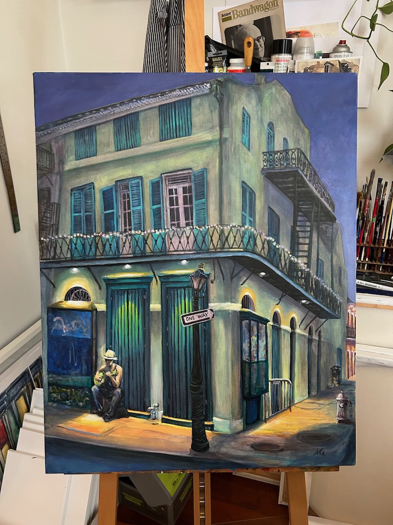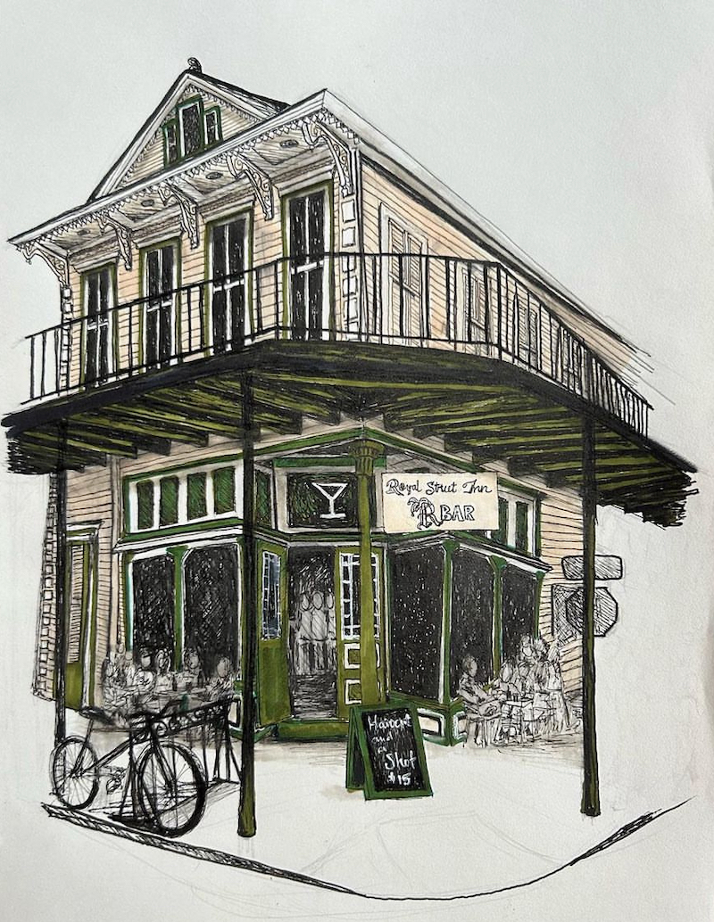 I love New Orleans. It’s got a lot going on. It’s weird, it’s classy, it’s trashy – it’s home. I usually take photos when I’m out and about and that’s what I’ll do my paintings from. I have a lot of memories from when I was a kid. And I’ve heard about places my grandparents or parents used to go to. So many buildings there are the same but they’ve been so many owners. My grandpa was a trumpet player and he played at some great places- which I’ve created pieces from. Or I’ll take a picture when I’m walking down a street in the French Quarter and imagine how many other people have been down this same street over the hundreds of years it’s been here. Or it’s my favorite bar or one of my favorite food joints.